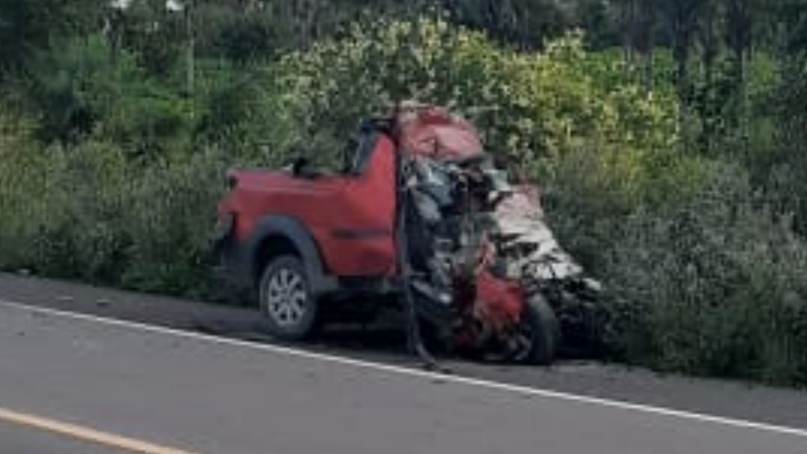 Devido a força do impacto a pick-up ficou com a frente totalmente amassada que chegou a estourar o crânio do motorista.